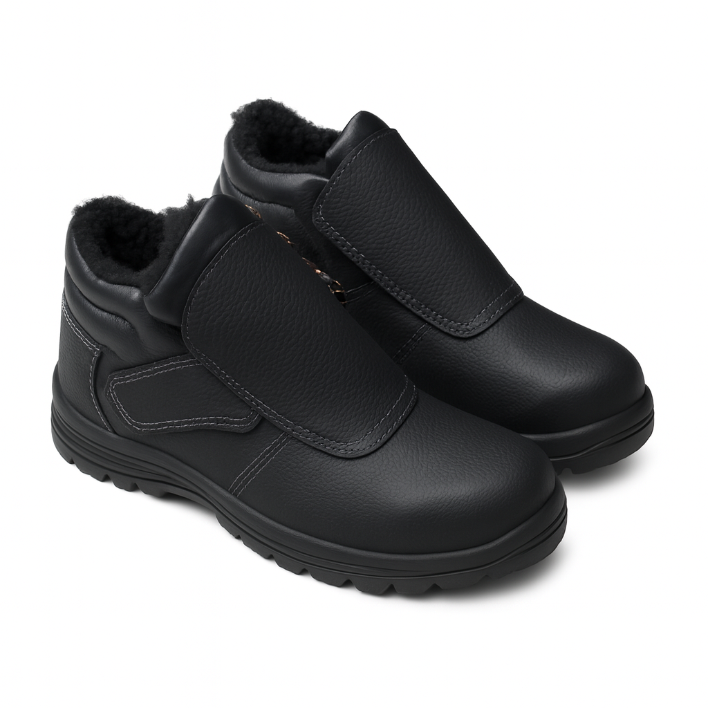Ботинки сварочные Blackwinter изготовлены из натуральной кожи, оснащены металлическим подноском для защиты стопы и полиуретановой подошвой, устойчивой к температурам и скольжению. Верхняя часть имеет специальный клапан, который закрывает шнурки и фиксируется на липучке, обеспечивая защиту от искр и брызг металла. Внутри используется искусственный мех-утеплитель, что делает обувь комфортной для работы в холодное время года.